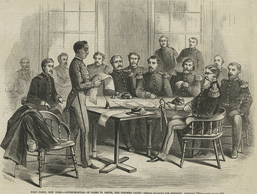 Flipper arrived at West Point in 1873, well aware of Smith’s bitter struggles there. Smith had faced relentless harassment, three court-martials, and eventual dismissal just a year before graduation (the drawing below captures Smith reading his defense statement at his court-martial hearing at the United States Military Academy, January 12, 1871).